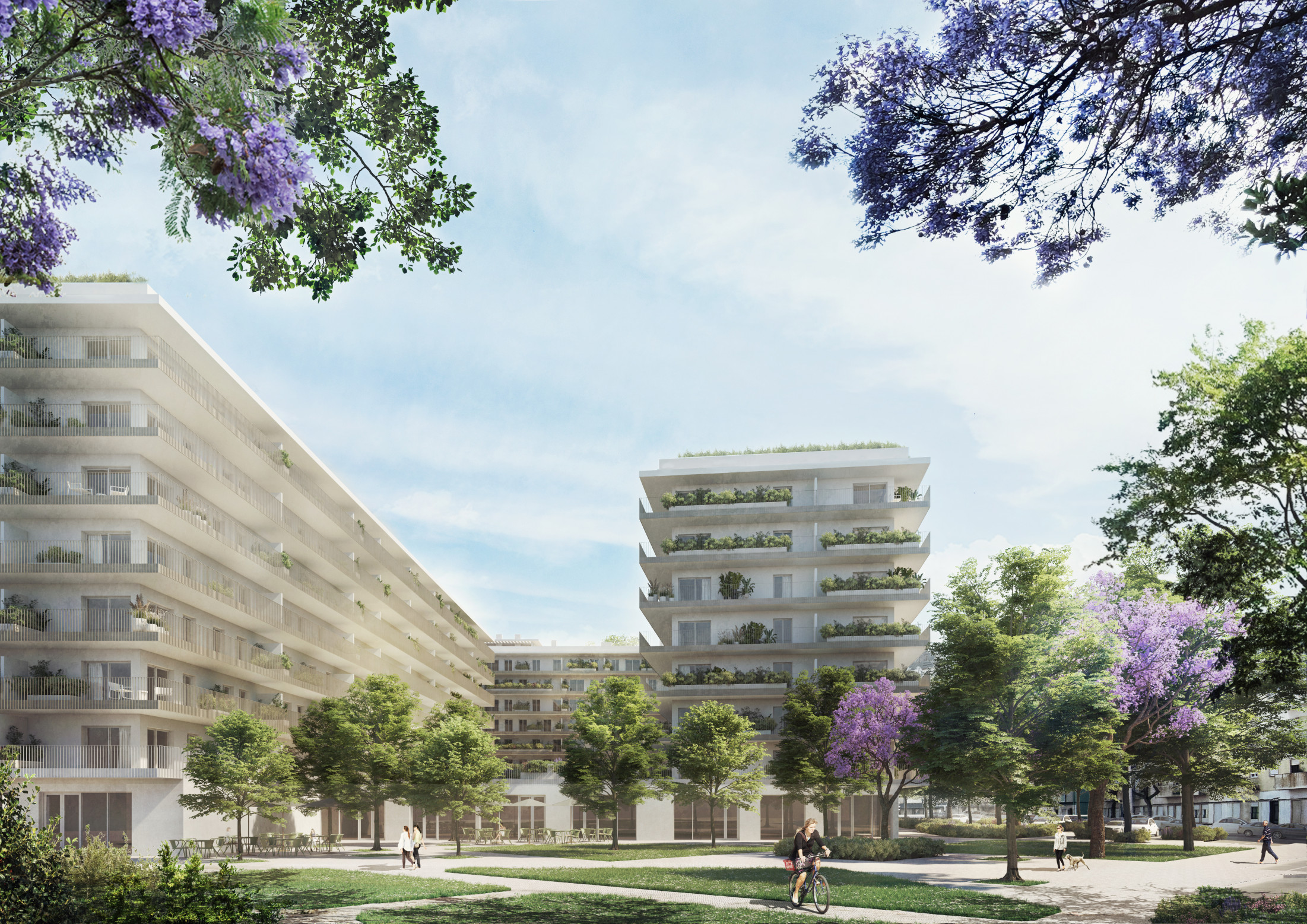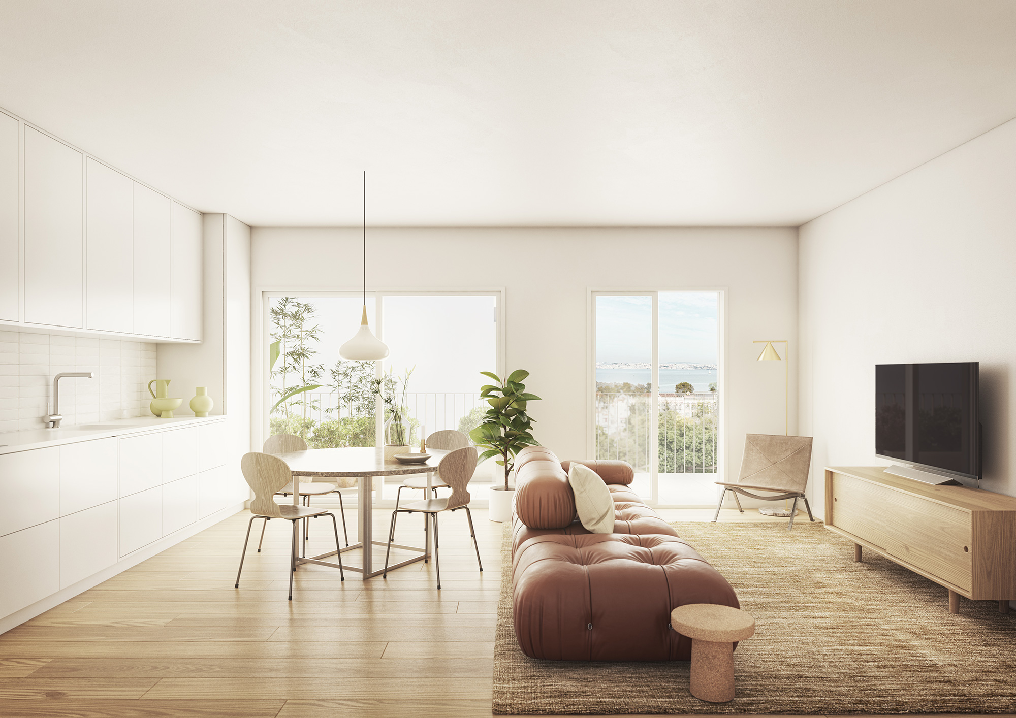 Transformação de um terreno de 1 hectare no centro histórico do Barreiro, num projeto residencial e comercial único com rooftop comum e piscina partilhada,varandas generosas, jardins e terraços privativos, e vistas para o rio Tejo.